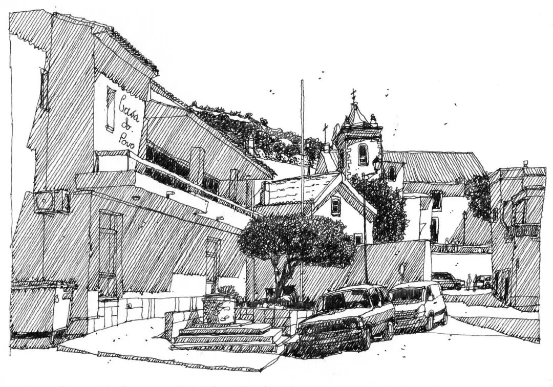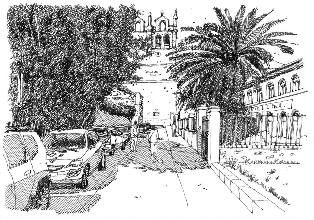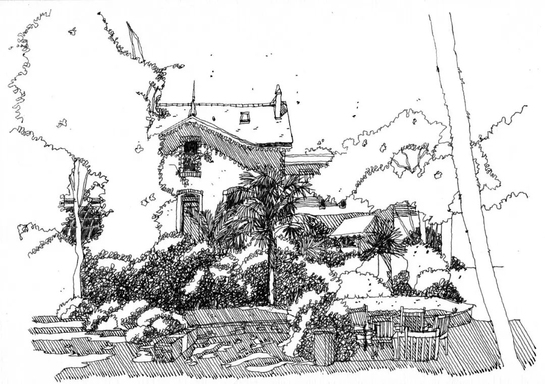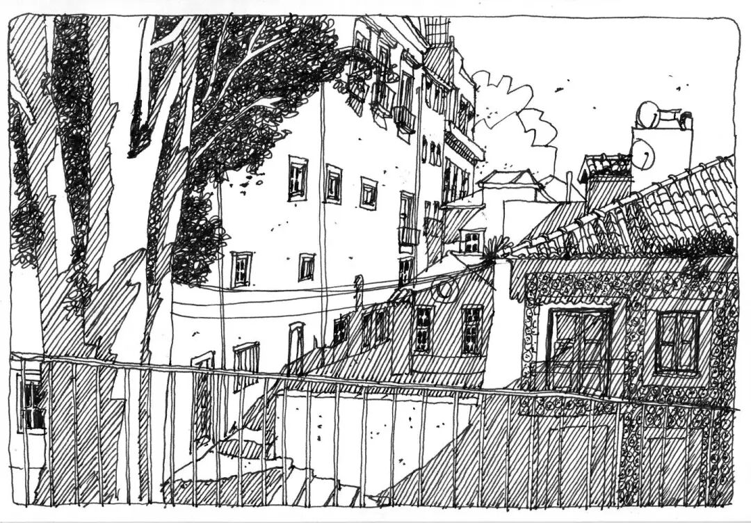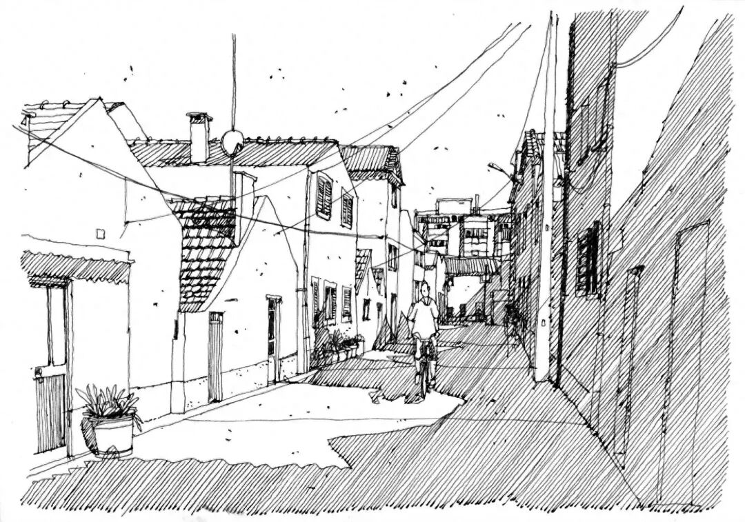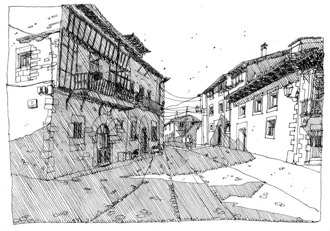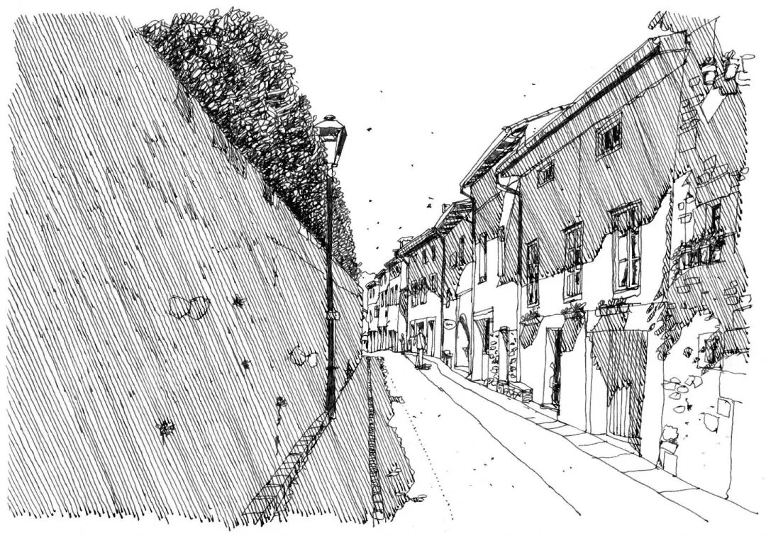 With the frame composition, the landscape is in a sense of lens, and the drawing paper in the matrix is broken to make people feel the relaxation of painting, making use of the density of lines and the rhythm of near and far. The choice in the painting also needs to be bold, to depict some elements with obvious and rich features, while in the distance, the outline of the line introduction and the near point form a gap.